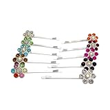 This is a set of 1 dozen pairs of crystal flower hair clips. Two of each color. These are small and are adorable additions to spruce up a look. Assorted colors that you can choose from to match any outfit. Sold by the dozen. You will love the way they make your hair look and add sparkle to your style.